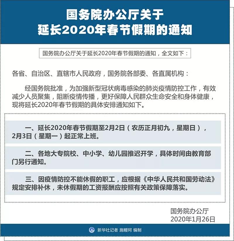 一、延长2020年春节假期至2月2日(农历正月初九,星期日),2月3日(星期一)起正常上班。