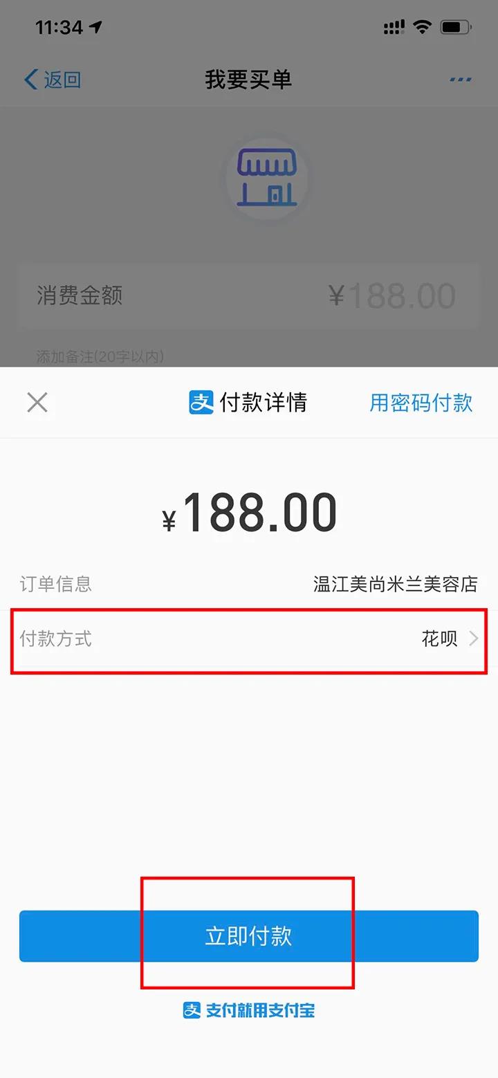 七、支付方式选择“花呗”或者“信用卡”,点击【确认支付】,完成支付。