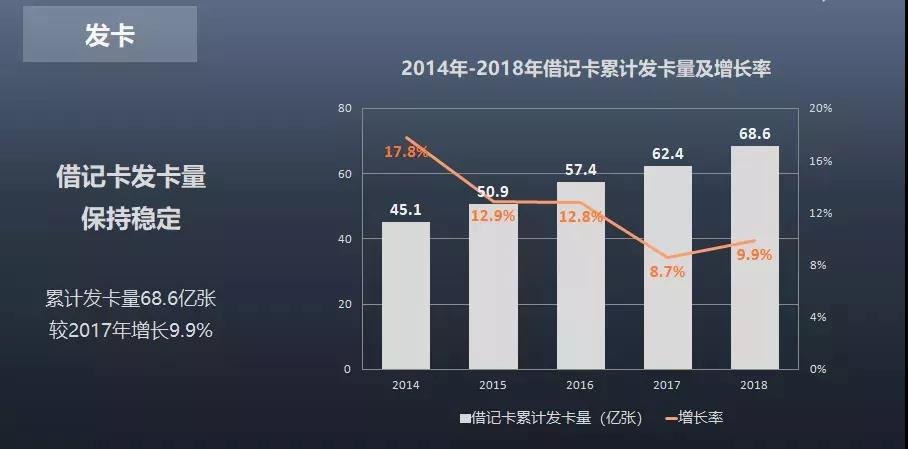 其中,信用卡累计发卡量为9.7亿张,较2017年底增长22.8%,信用卡人均持卡量为0.7张;借记卡累计发卡量为68.6亿张,较2017年底增长9.9%,借记卡人均持卡量为4.92张。
