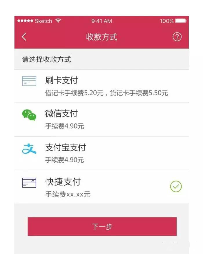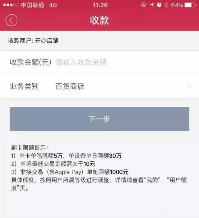 输入消费金额,选择“业务类别”:小微商户收款、上门收款(快递送餐房租等)、生活缴费(物业费水电煤停车费等)之后,点击“下一步”,选择“收款方式”。