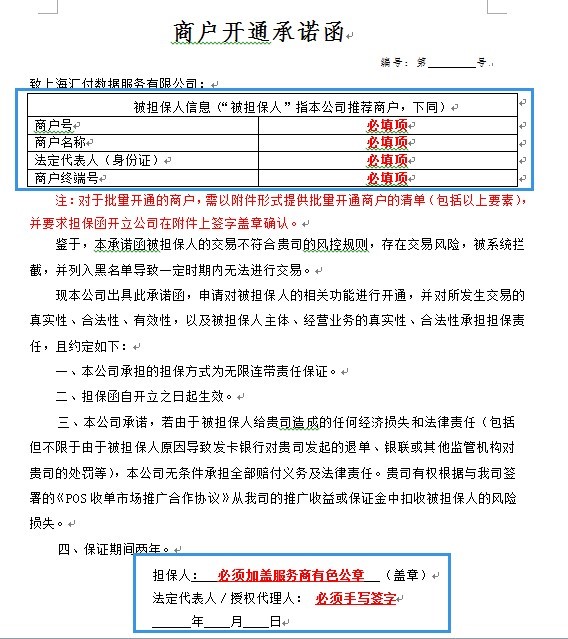 2. 提交要求:每天申请开结算的商户资料统一汇总成一张明细表和全套担保函材料,作为附件以一封邮件形式