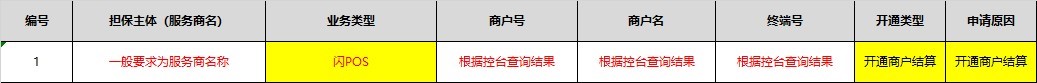 1、 邮件正文填写:【闪POS商户结算开通】,并提供商户号、商户 SN 号、商户名称;